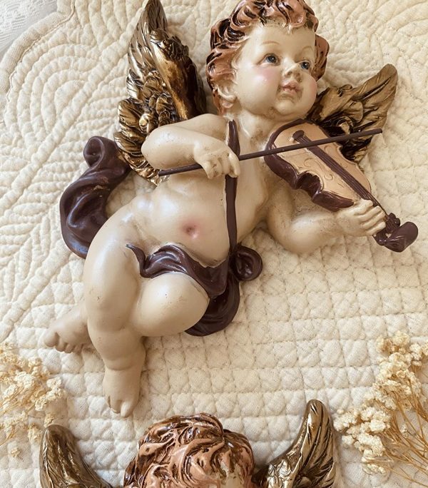 Élégant et magnifique ange décoratif couché avec violon, en poly résine aux détails dorés et rouges.