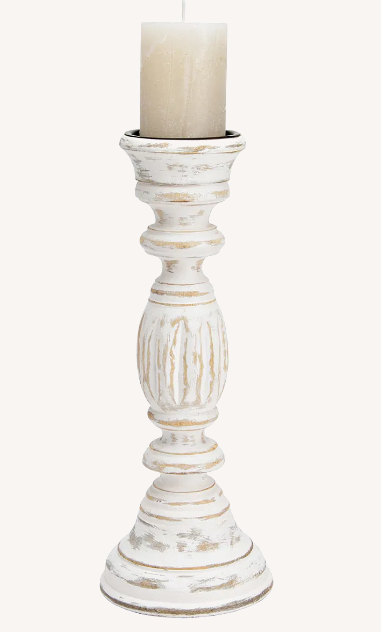 C’est un bougeoir élancé et élégant, d’environ 40 à 50 centimètres de hauteur, taillé dans un bois massif patiné d’un blanc légèrement vieilli. La peinture laisse deviner par endroits les veines naturelles du bois, créant cet effet authentique et chaleureux typique du style campagne chic.