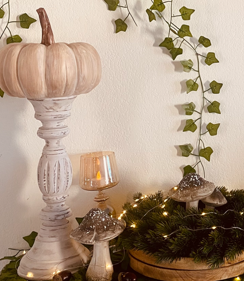 Crée une composition : associe ton bougeoir à plusieurs citrouilles (naturelles ou décoratives) et à des feuillages séchés.