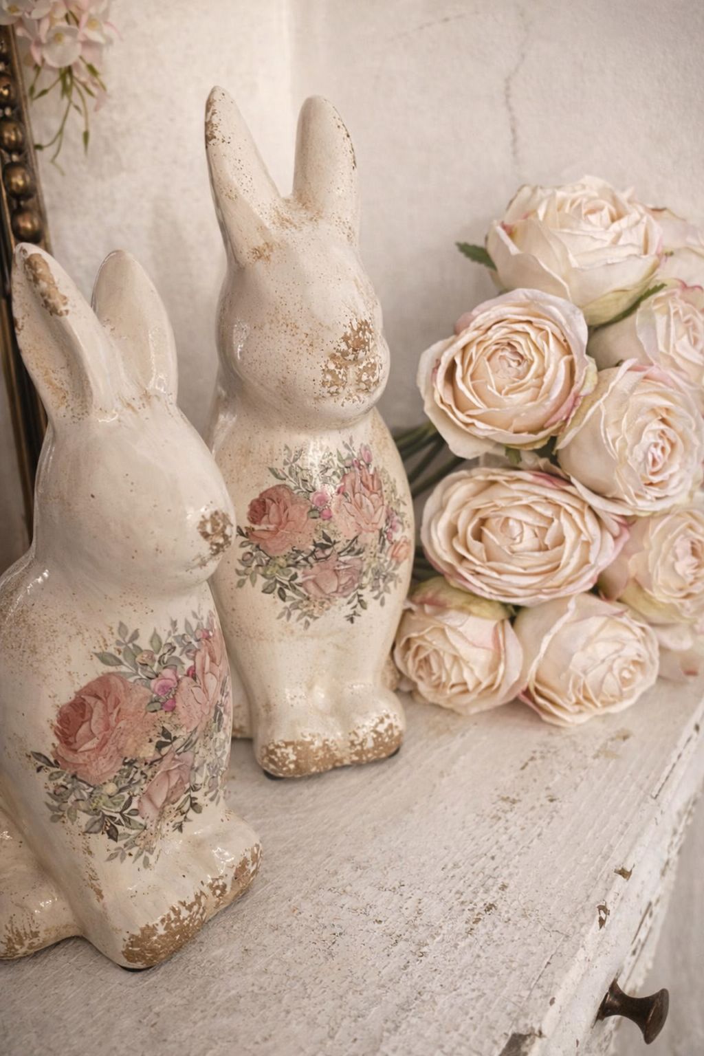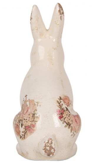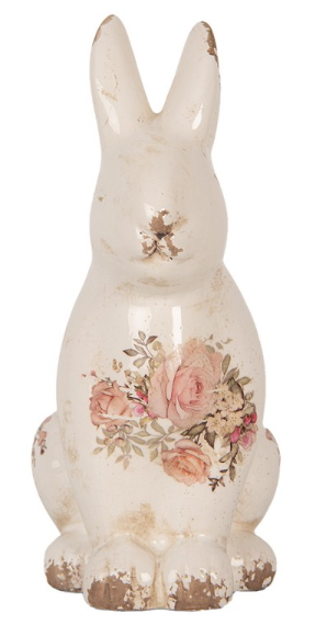 Ce lapin décoratif en céramique séduit par son charme délicat et son esprit romantique. Habillé d’imprimés de roses, il se distingue par sa teinte beige douce et son effet légèrement abîmé, qui lui donne un aspect patiné et authentique, inspiré du style shabby chic.