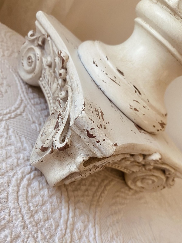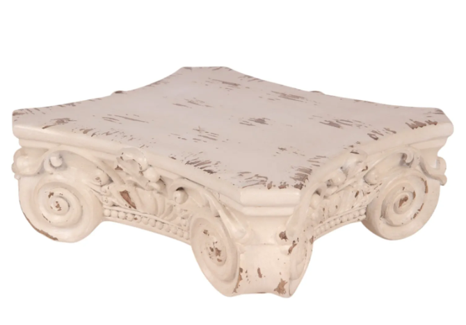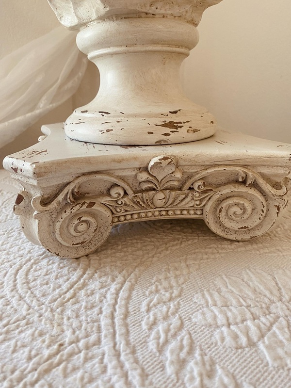 Le socle blanc est en résine et décoré d’ornements inspirés de l’Antiquité.