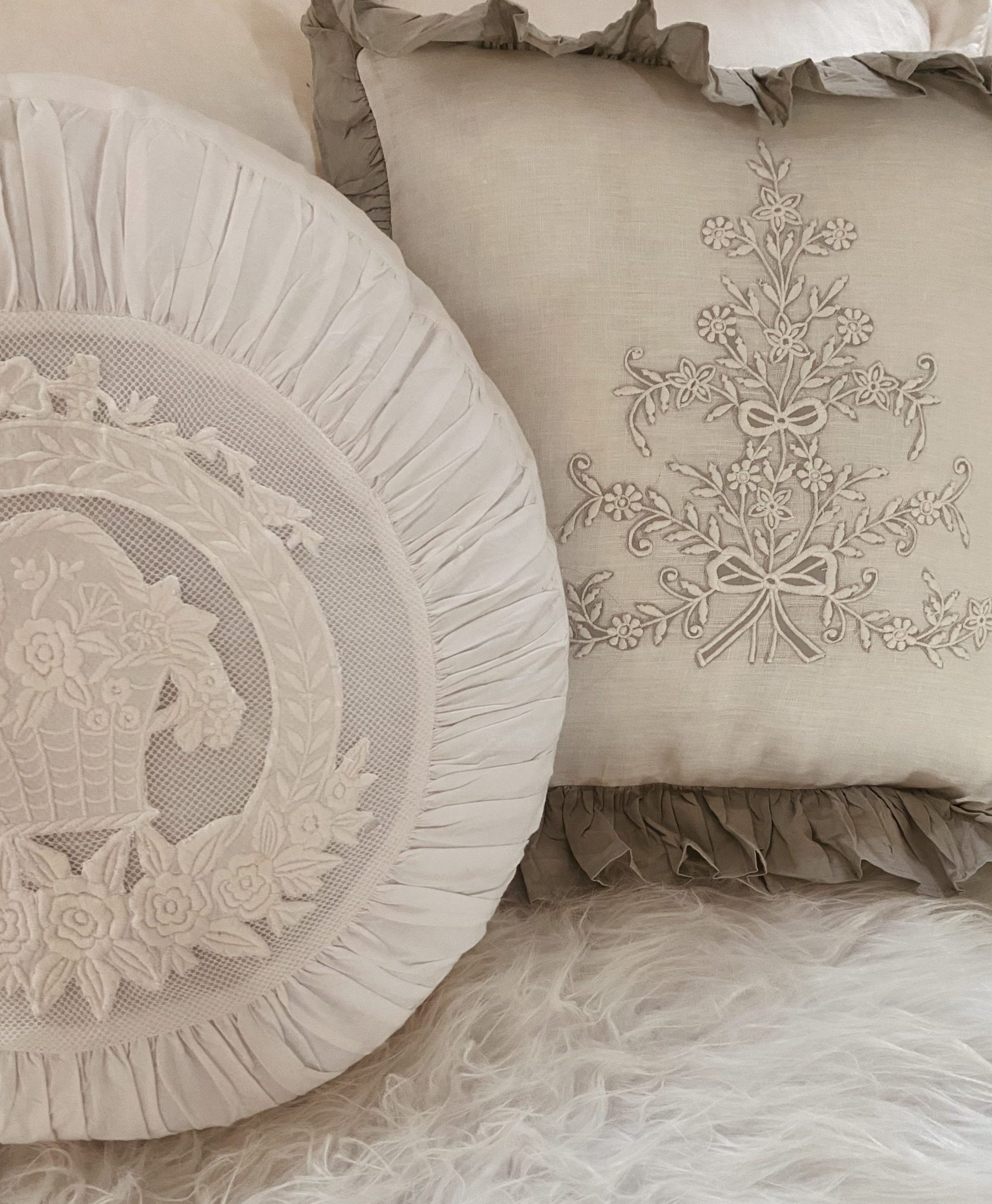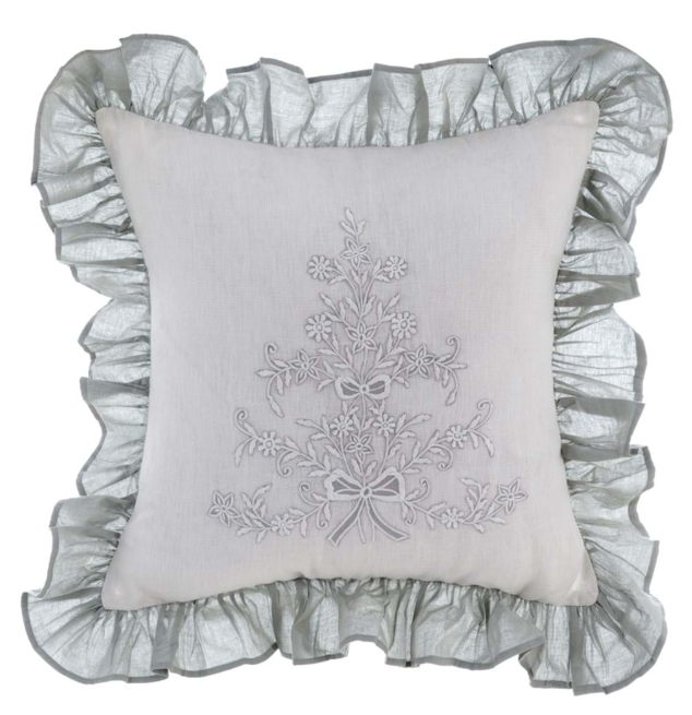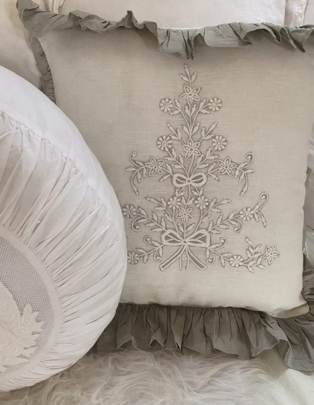 Son motif central en forme de sapin, délicatement travaillé, évoque la chaleur des fêtes et les ambiances cosy des maisons de campagne. Les volants raffinés qui l’encadrent ajoutent une note de féminité et de douceur, typique du style shabby chic.